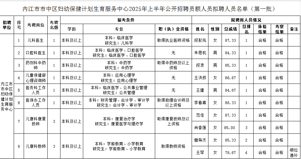 按照《内江市市中区卫生健康局 内江市市中区妇幼保健计划生育服务中心关于2025年上半年招聘员额人员的公告》的相关规定,经面向社会发布公告、公开报名、资格审査、考核、体检和考察等环节,现将拟聘用人员名单(第一批)公示5个工作日,详见附件。